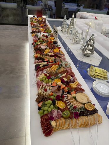 This table includes 12+ types of premium and fine cheeses. 6+ types of premium and fine cured meats, a variety of spreads and dips, jams, seasonal fruit, olives, pickles, crackers, baguette, nuts, chocolate, dried fruit for decorations.