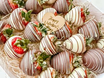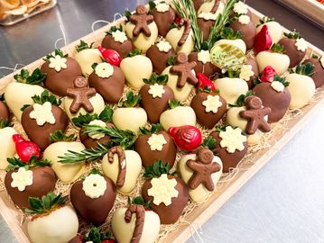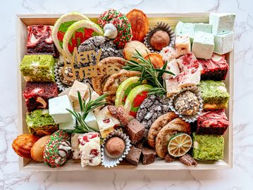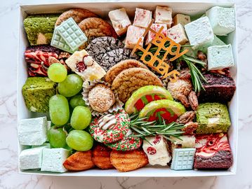 Includes a variety of holiday themed and flavored desserts and chocolates with a Merry Christmas Sign